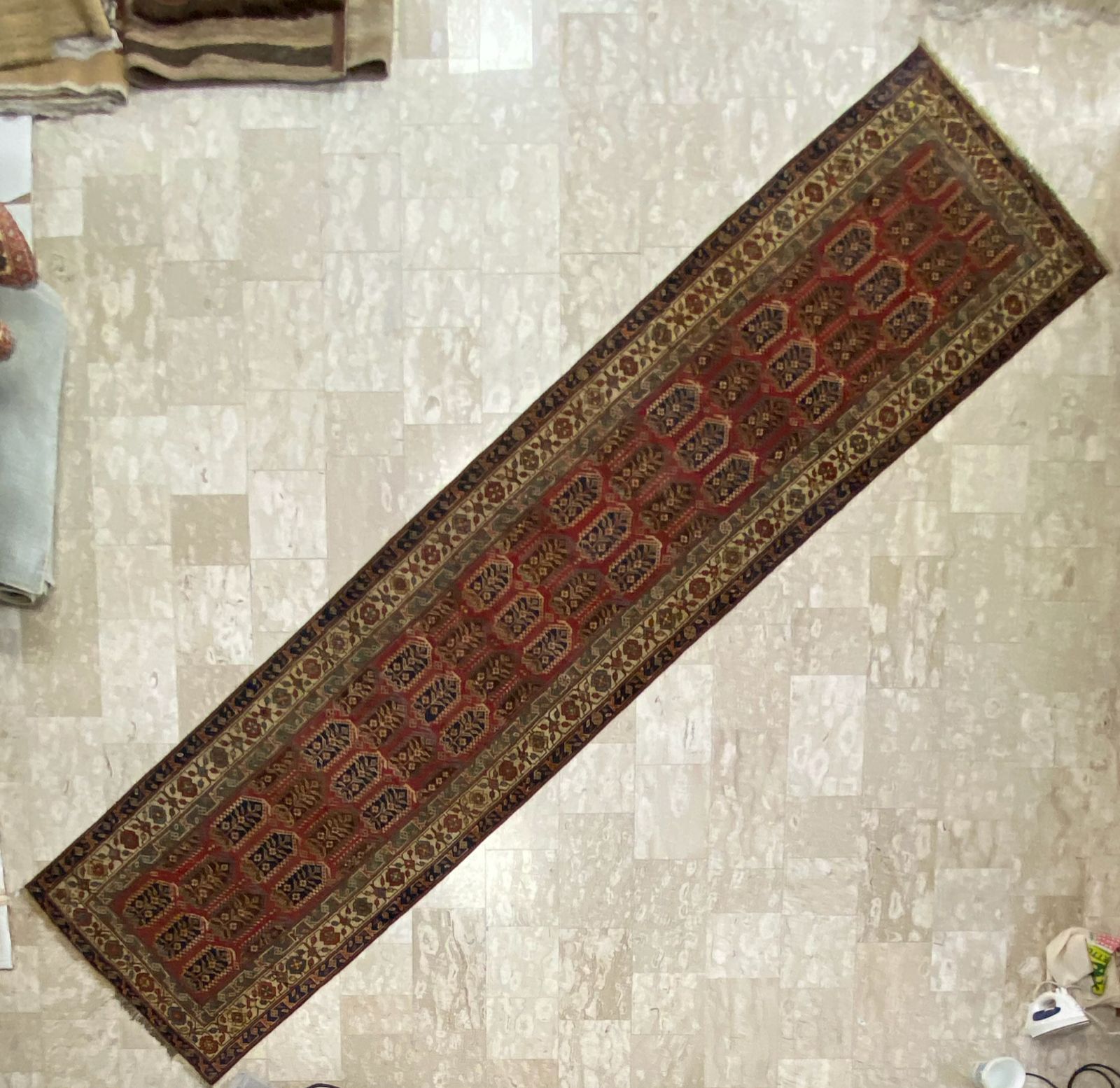 Disegno kashmir abbinato ad una bordatura ricca è tipica dei tappeti caucasici vecchi e antichi. Lana su lana . Mis: 394x 90